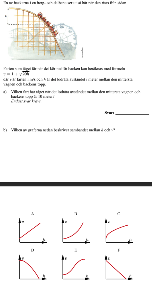 Jag skulle i denna uppgift bestämma vilken graf som visar hur vagnens fart ändrades då avståndet från mittvagnen till toppen ökade. Jag tänkte bara rimligt att när vagnen är högst upp har den som lägst fart, därav kan man utesluta D och f som är negativa funktioner kan man säga. Ju längre vagnen åker nedåt för banan desto snabbare går den, därav är det inte A. Då står det mellan B, C och E. Sedan fortsätter ju farten inte att öka exponentiellt som i B, för vi har ju krafter som påverkar vagnen och gör att den inte konstant kan accelerera då den inte har en motor. Då är C rätt. Men denna förklaring är inte ett dugg matematisk, så jag undrar vad jag hade kunnat förbättra för att plocka alla poäng i denna fråga. Hur kan jag motivera att de avtagande graferna tex inte kan stämma?