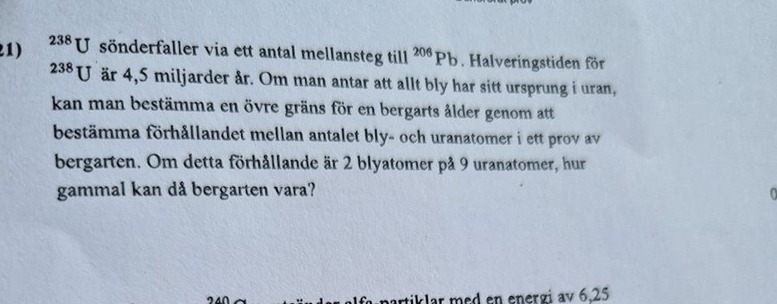 jag tänker att förhållandet 2/9 = (N0 - N)/N. Då N är antalet som uran atomer som finns efter tiden, och N0-N då är antalet som sönderfallit och då blivit till bly atomer. Hur ska jag kunna gå vidare från detta?
