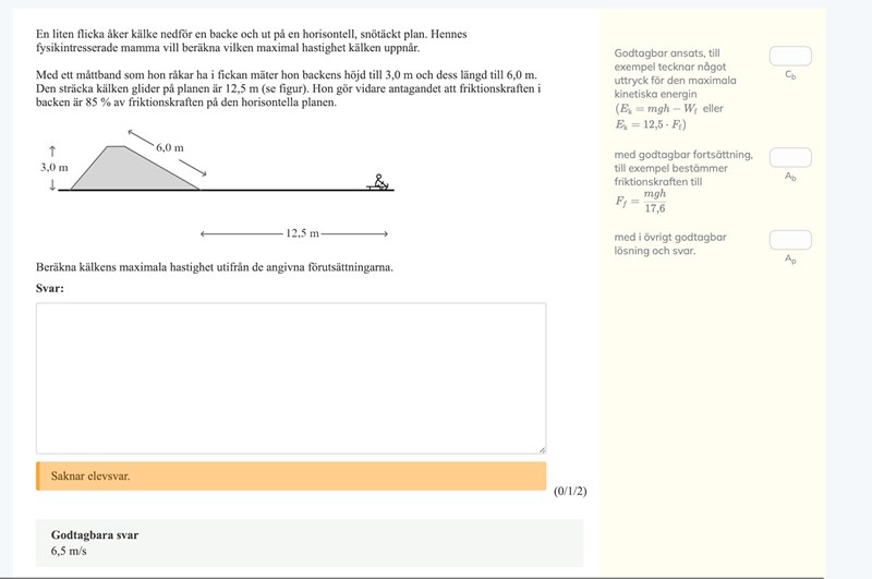 Det håller jag med om, hastigheten är högst just där backen blir plan. Friktionen på den plana delen är så stor att kälken bromsas från den högsta hastigheten till 0 på 12,5 m. Bromskraften är ... Kommer du vidare?