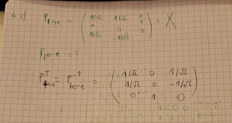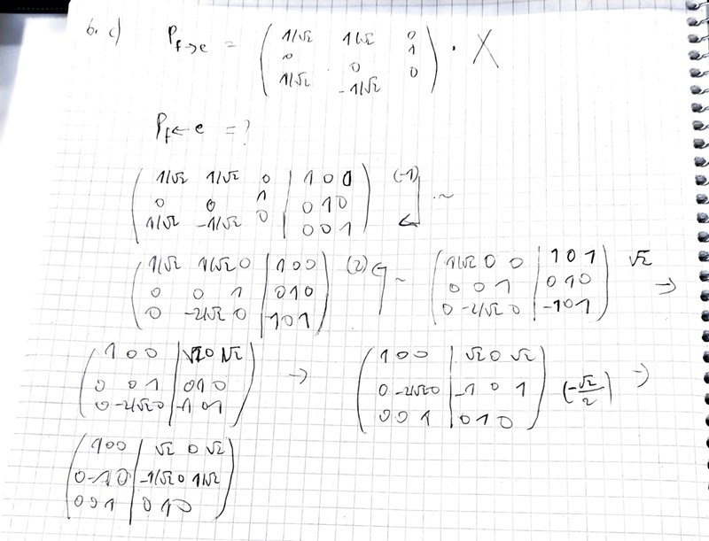 Jag försökte hitta avbildningsmatrisen då jag tänkte att vi behöver ta fram inversen för P som gick från f till e. Men det blir ej rätt svar.