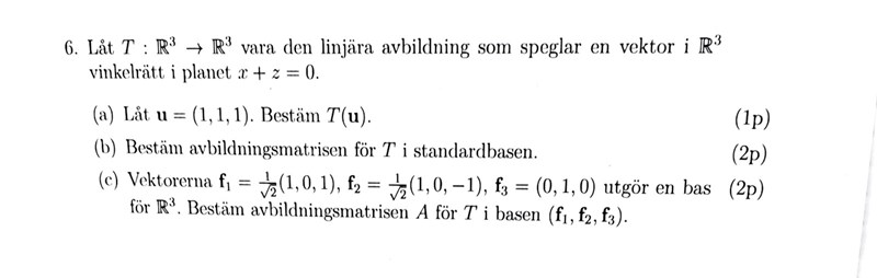PATENTERAMERA skrev:Du skall beräkna matrisen för T i basen f. Du behöver använda ditt svar på b) och de basbytesmatriser som du räknat fram.