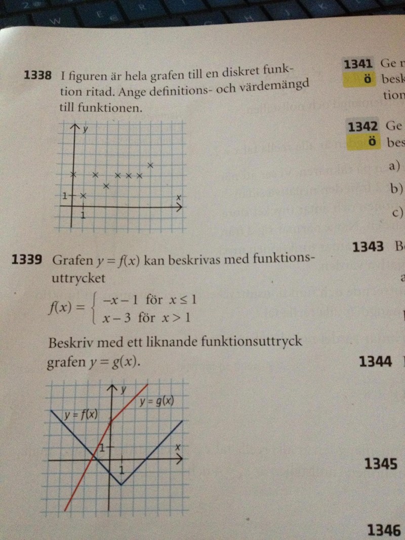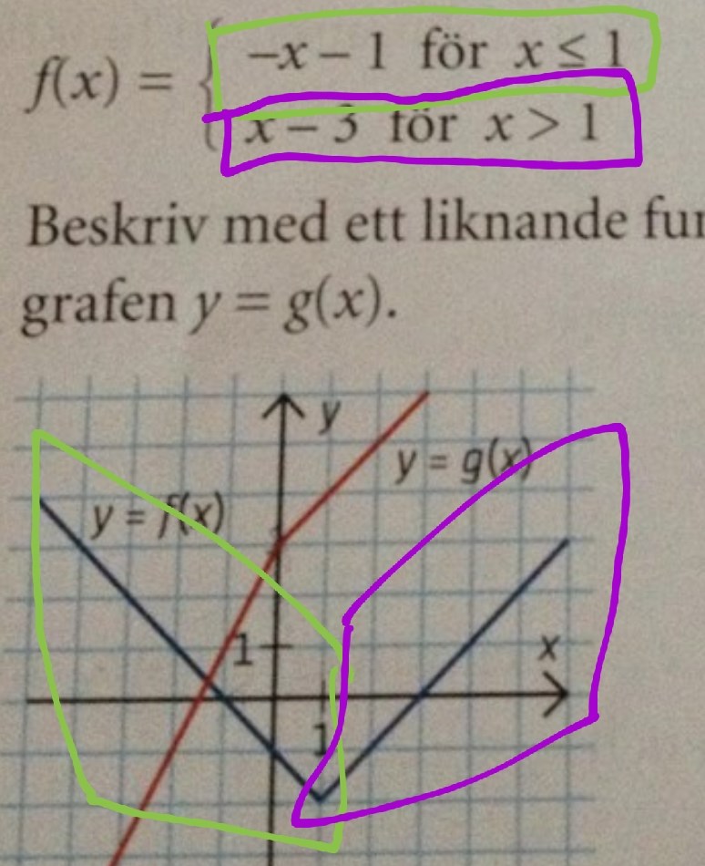 Du har hittat ekvationen y=-x-1 för vänster del av blå graf, och y=x-3 för höger del. Ser du att det är precis vad som står i funktionsuttrycket? Och så har man angivit vilka x som tillhör vänster respektive höger del.