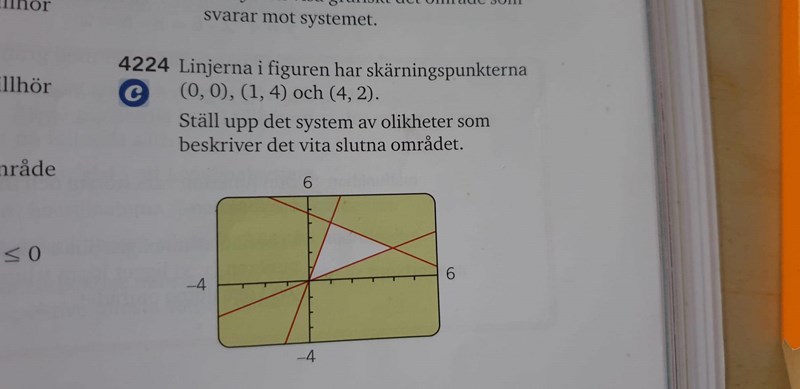 Smutstvätt skrev:Hur menar du med c och k? Om du hittar ekvationen för den räta linje som skär punkterna (1,4) och (4,2), kan du ställa upp kravet att värdena ska ligga under den linjen. :)