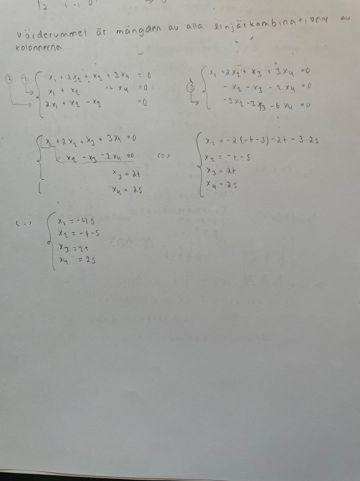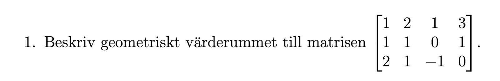 När de säger värderummet, menar de värdemängden? I lösningen så står det att värderummet är mängden av alla linjärkombinationer. Ska man då ansätta att kolonn 1 t.ex. är u1 och sedan sätta att u1=x1u2+x2u3 och på så sätt kolla varje vektor?