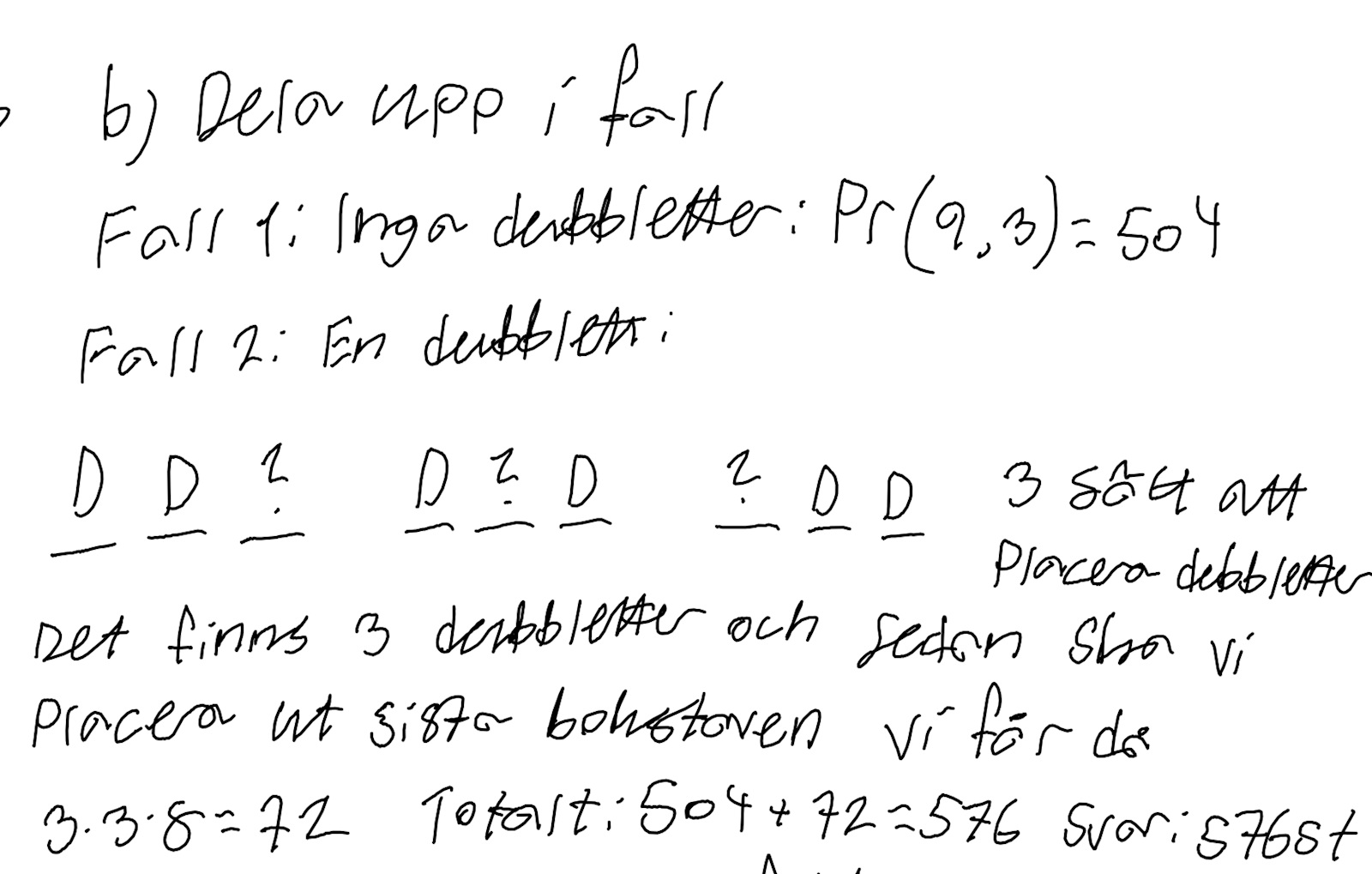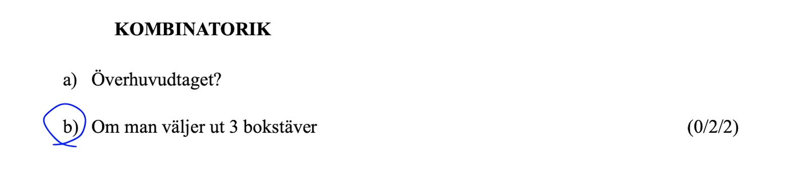 b) 12C3 * 3! då man först väljer 3 av 12 bokstäver. Därefter kan dessa grupper om 3 ordnas på 3! olika sätt (ordningen i varje grupp). Fel enligt facit.