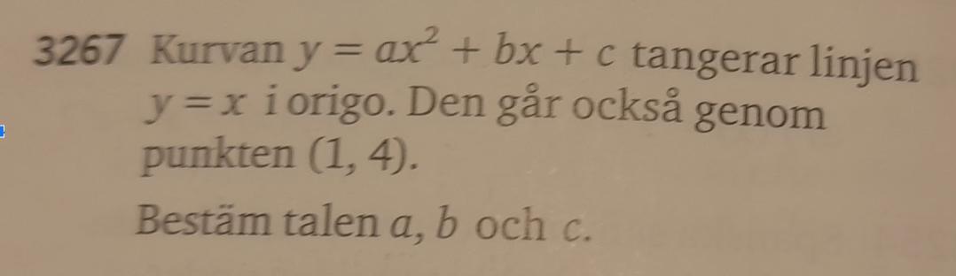 Den tredje ekvationen får du genom att sätta funktionens derivata likal med y=x :s derivata för x=0.