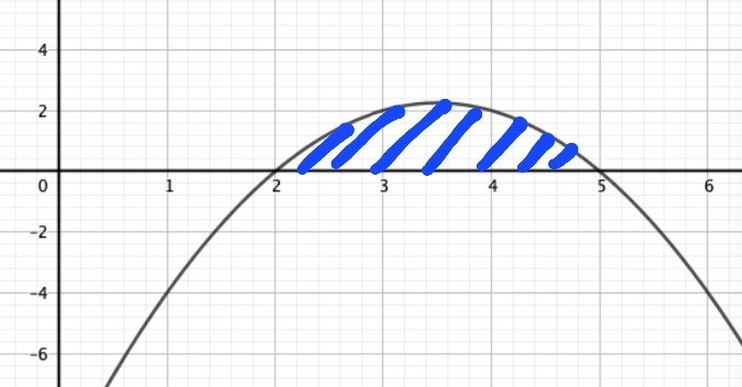 Arean för ovanför x-linjen borde val va med integral intervallet mellan 5 och 2