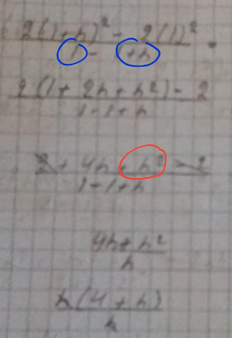 Du verkar ha kastat om ordningen på termerna i nämnaren. Det ska vara (1+h) - 1 där (blåmarkerat)
