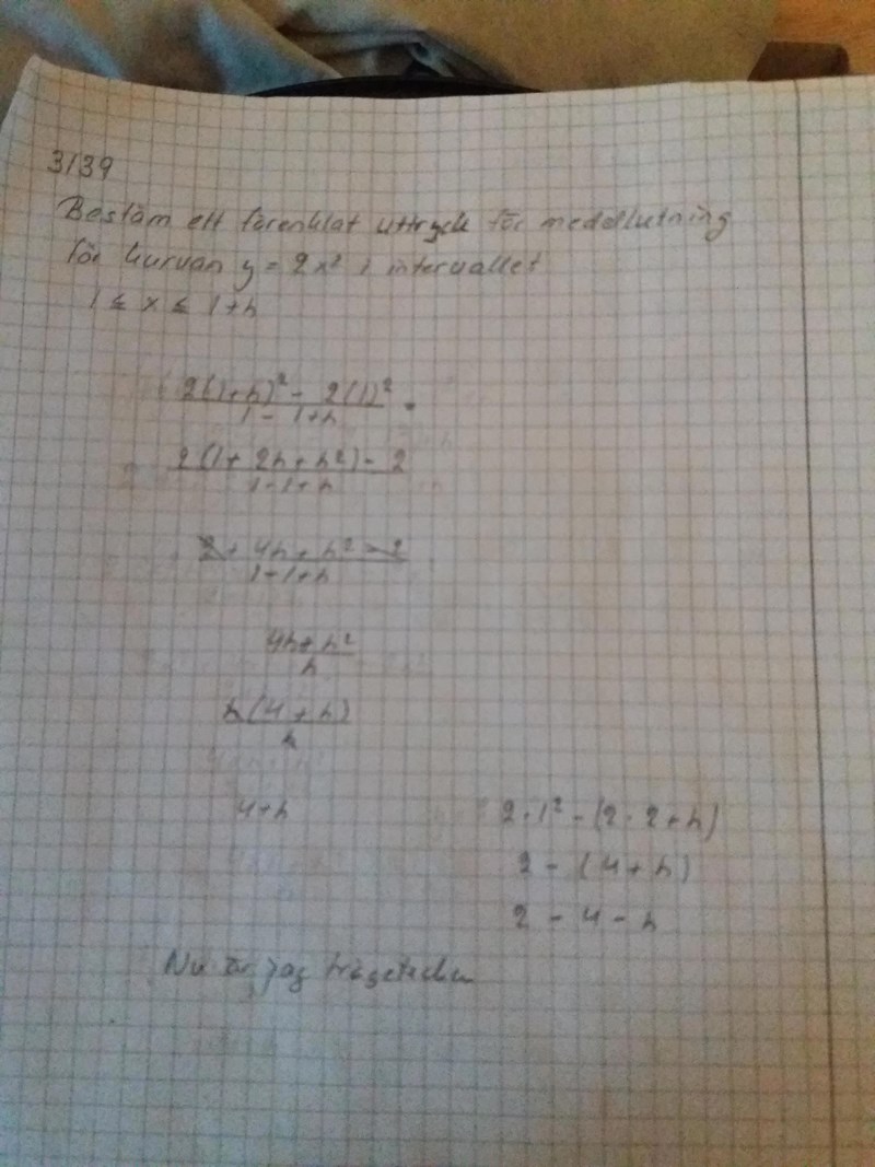 Nej, här är det medellutningen i ett intervall man är ute efter, inte derivatan. Du är alltså färdig när du har kommit fram till uttrycket 4+h. 4+2h.