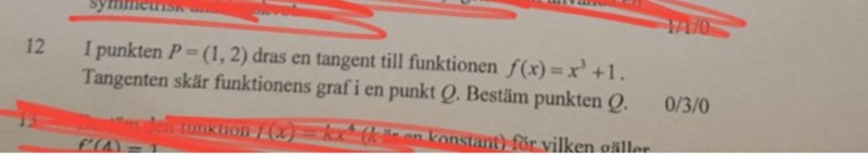 I uppgift 12 så är punkten P känd. Däremot punkten Q som också ligger på grafen okänd. Tangenten i det här borde ha samma K värde. Och punkterna ska vara
