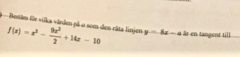 Behöver ha hjälp med hur jag ska påbörja lösningen av uppgiften. När något ”tangerar” så vet jag att det betyder att den typ nuddar grafen f(x).