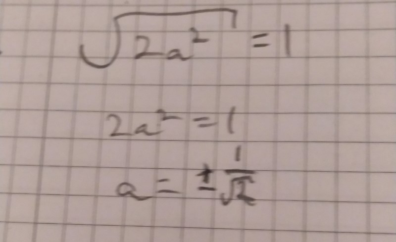 Facit säger bara 1/roten ur 2. Varför har de inte minuslösningen också. Jag får också bara ett svar om jag skriver ✓2*√a^2=√2*a men tappar man inte en lösning då?