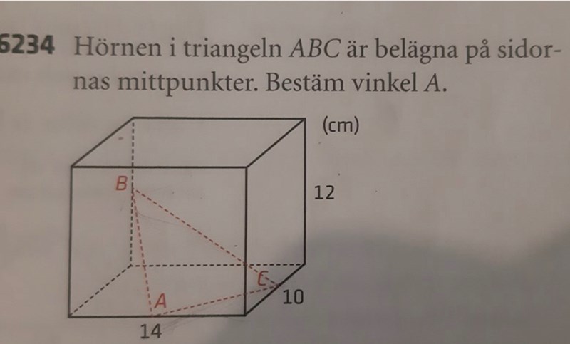 Det här sista är inte rätt. Den intressanta triangeln är ABC så för att kunna beräkina vinkeln vid A behöver du känna till längderna av AB, AC och BC.