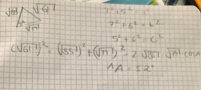 Jag får vinkel A till att bli 52 grader. Men enligt facit är det 90 grader. Vad gör jag för fel?