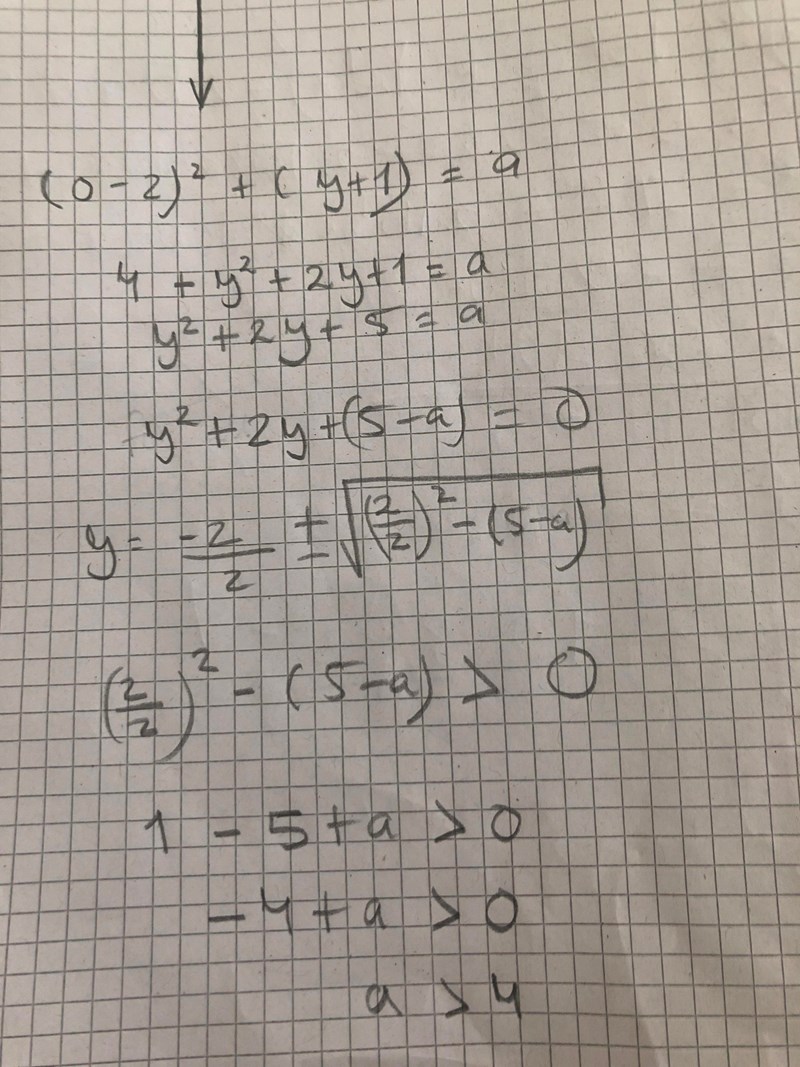 Om en cirkel har ekvationen (x-2)^2+(y+1)^2=a, för vilka värde på a har ekvationen flera skärningspunkter med y-axeln?