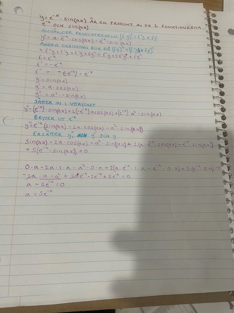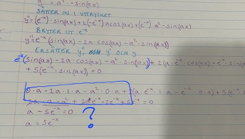 Jag behöver hjälp med denna. Jag har gjort så långt jag kunnat men förstår inte hur jag ska få in y= e^-x*sinax samt hur jag räknar ut a