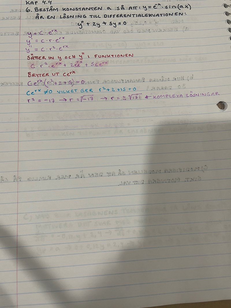 Om vi nu sätter in detta i diffekvationen y''+2y'+5y = 0 så får vi