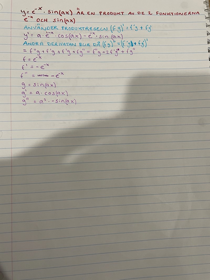 Funktionen y = e-x•sin(ax) är en produkt av de två funktionerna e-x och sin(ax), så du måste använda produktregeln (fg)' = f'g+fg' för att derivera den.