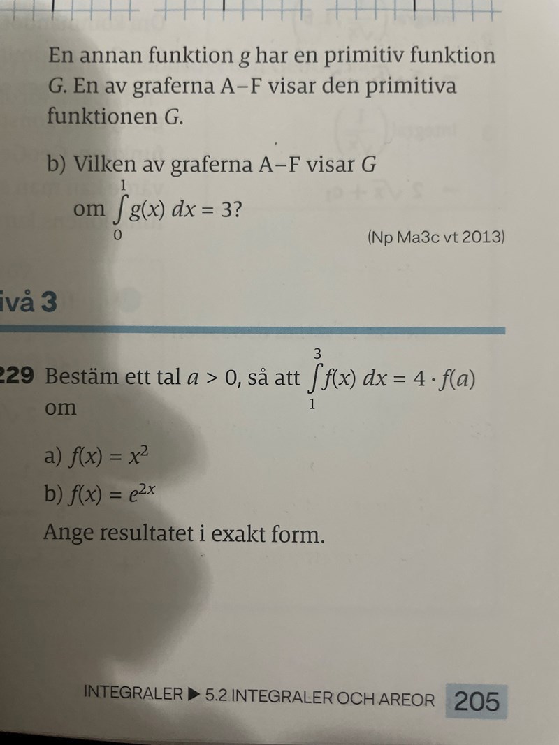 Hej skulle behöva hjälp med denna, jag testade att hitta den primitiva funktionen som blev x^3/3 sedan satte jag in 3 o 1 och fick 9-1/3, jag tog den lika med 4*f(a) sedan delade med fyra. Då fick jag f(a)=2,611.. jag satte in 2,611=x^2 tog roten ur men fick fel svar.