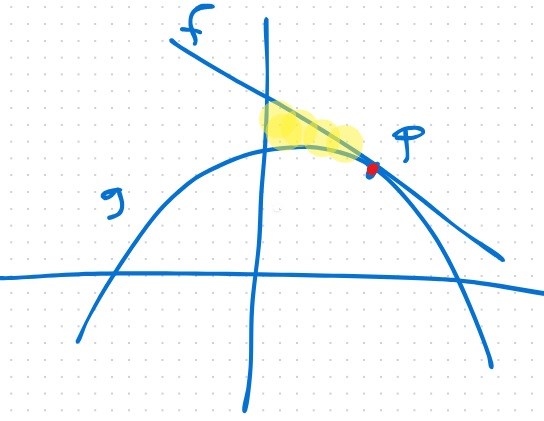 En rät linje f(x) = är en tangent till andragradsfunktionen g i punkten P med x-koordinaten 3. Parabeln är symmetrisk kring y-axeln: g(x) = ax2 + b. Bestäm arean markerad i gul.