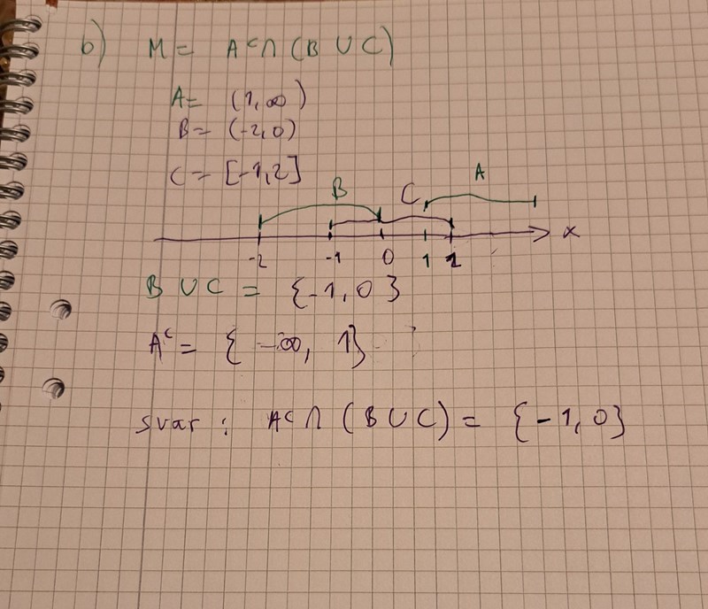 Om vi söker snittet mellan A^c och BUC så blir svaret (-2,-1,0,1) eller? Det är dessa tal de har gemensamt i båda mängderna.