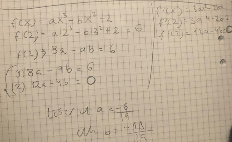 Funktionen 𝑓(𝑥) = 𝑎𝑥^3− 𝑏𝑥^2+ 2 har extremvärdet 6 för 𝑥 = 2. Bestäm konstanterna a och b samt extremvärdets karaktär.