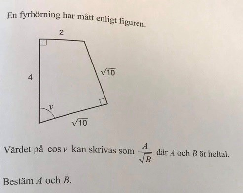 Jag har först försökt dela fyrhörningen till två trianglar sedan fick jag två rätvinkliga trianglar en med sidorna roten ur 10 och en med sidorna 2 och 4. Sedan bestämde jag den gemensamma hypotenusan till roten ur 20 men jag kommer inte på vad jag kan göra sen, eller om jag har gjort rätt.