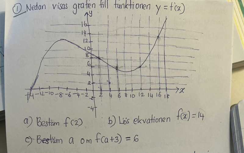 Om f(a+3) = 6, vad kan a+3 vara då, enligt grafen? Det finns två lösningar.