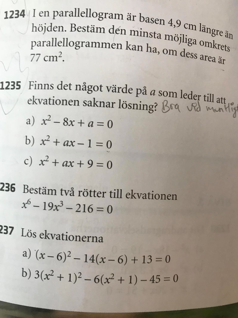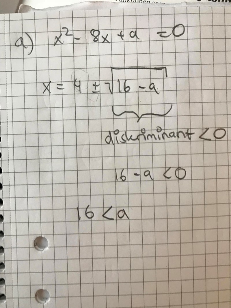 Men, för att svara på din fråga: Om så skulle du få . Det ger två lösningar och således har den fortfarande lösningar. Om a är mindre än 16 så kommer du hela tiden få ett positivt tal, så för att den ska ha icke-reella lösningar så måste .