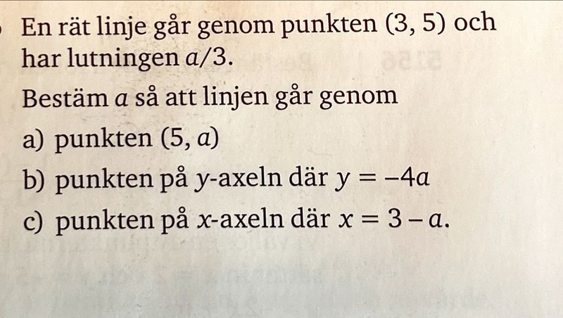 b) Vi vet att linjen y = kx+m går genom punkterna (3,5) och (0,-4a) samt att k = a/3.