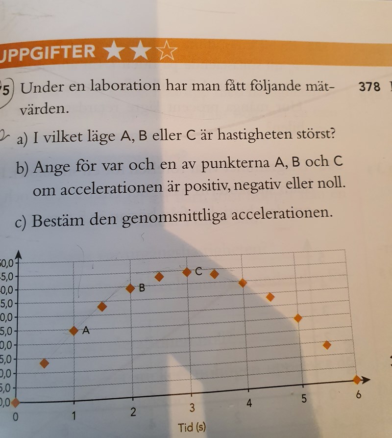 Tips: Hastigheten vid en viss tidpunkt är lika stor som s/t-grafens lutning vid den tidpunkten. Så för att svara på a-frågan behöver du bara bedöma vid vilken av punkterna som s/t-grafen har störst lutning.