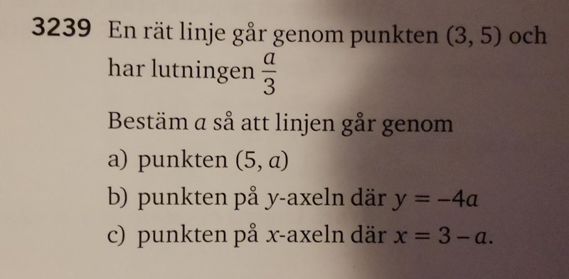 Vet ngn hur man kan lösa denna? Fattar inte hur de vill att man ska lösa det, facit säger att a behöver vara 31/5 (6,2) för att linjen ska gå igenom punkten (5,a). Uppskattar hjälpen.