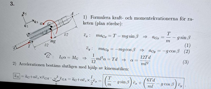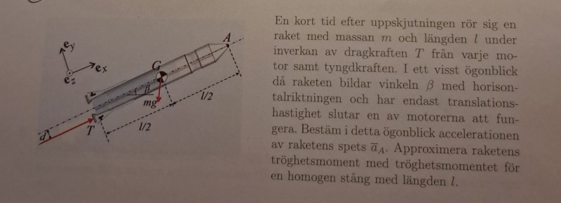 yes det var exakt den jag använde. Jag gjorde alla steg korrekt som facit , men de har tagit med en term från aG,y enligt deras lösningsförslag nedan och jag är tyvärr inte med på varför de har valt att göra det.  En annan sak som jag inte är heller är med på  är varför vinkelhastigheten som då är 0 inte medför att vinkelaccelerationen är 0 ? Vinkelaccelerationen är konstant i detta fall. Jag tänker raketen snurrar och roterar inte, så hur kan en vinkelhastighet och vinkelacceleration uppstå?