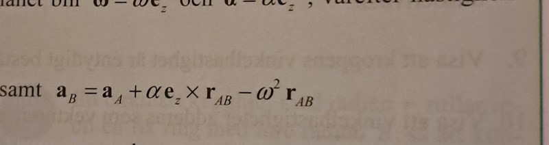 Därför att beräkningarna ledde till detta när jag använde accelerationssambandet. Jag fick termen som de fick med ex och sen med ey utan -gcosB. Alfaey×l/2ex blir ju 6Td/mley precis som de fått så jag förstår inte varför -gcosB ska komma med ? När det gäller a_gx fick jag med den termen.
