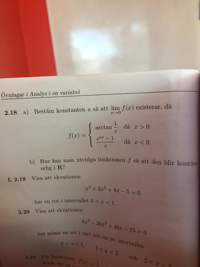 I det givna x:et ovan verkar det finnas ett gap i funktionen vid x=0. Därför vill jag bestämma ett värde f(x) då x går mot noll s.a. funktionen f blir kontinuerlig. Jag har förstått att i intervallet x<0 så går funktionen mot alfa. Alfa verkar alltså alfa fritt kunna väljas. Man vill välja ett alfa som gör att övergången mellan x är mindre än samt större än 0 möter varandra där så att en graf f(x) kan ritad utan att höja pennan från pappret. Nu försöker jag bestämma alfa mha. f(x) då x>0 men har fastnat. All hjälp uppskattas mycket!