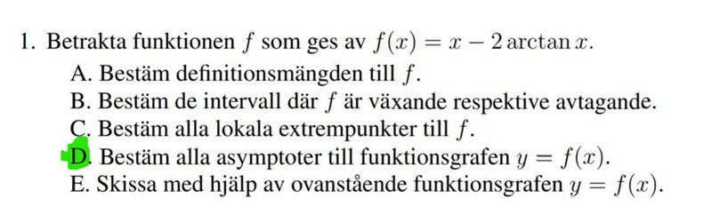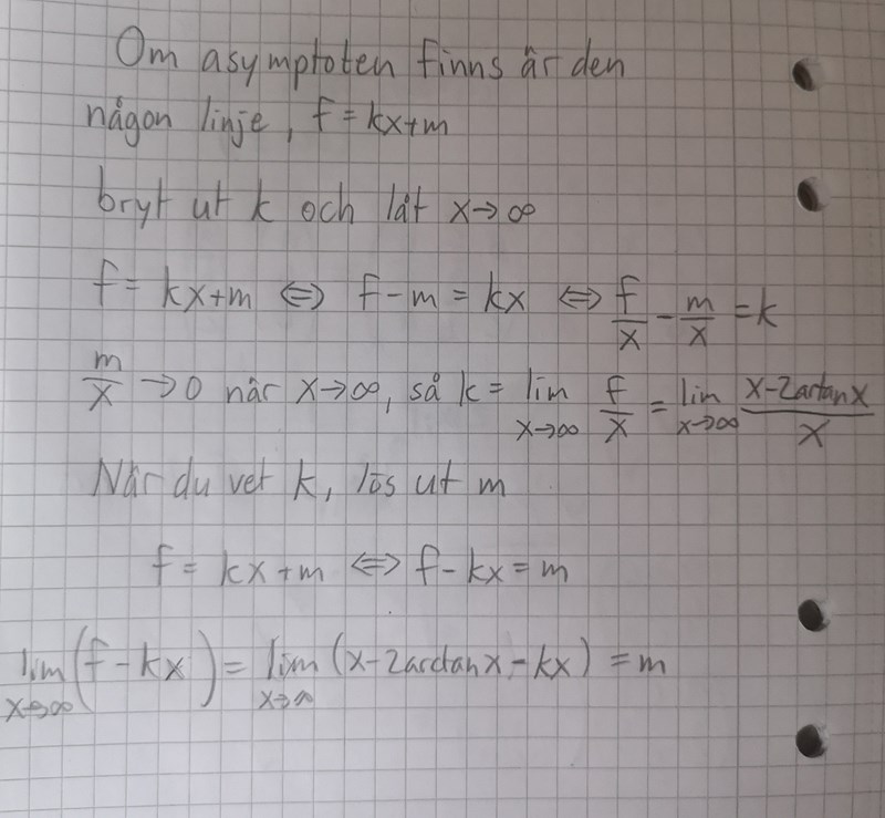 Sneda asymptoter kan identifieras genom att lösa ekvationenlimxf(x)-(ax+b)=0 för något a och något b. Vi provar: limxx-2arctanx-ax+b=limxx(1-a)-2arctanx-b. Från det kan vi läsa att a måste vara lika med 1. Då ska vi alltså hitta ett b sådant att limx2arctanx-b=0. Eftersom limx2arctanx=2π2=π kan vi sätta b=π.