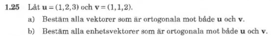 Men b) verkar vara rätt. Du har vektorerna , vilket är en linje i när antar olika värden. Alltså kan det max finnas två stycken sådana vektorer, så att dom är enhetsvektorer (dom pekar i motsatt riktning).