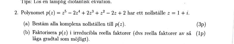 Bestäm alla komplexa nollställen samt faktorisera i irreducibla reella faktorer