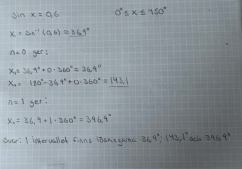Bestäm alla lösningar till ekvationen: sin 𝑥 = 0,6 𝑖 𝑖𝑛𝑡𝑒𝑟𝑣𝑎𝑙𝑙𝑒𝑡 sin x = 0,6 i intervallet 0° ≤𝑥≤450°