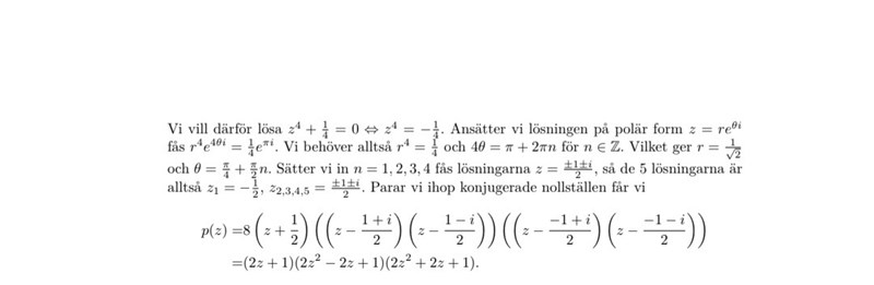 Jag förstår inte facits lösningsförslag när det gäller hur de löste ut r för att hitta övriga lösningarna mha de moivres formel. Sen förstår jag ej hur de faktoriserade p(z). Jag fick (8z^4+2)(z+1/2). Men de fick en massa termer som jag ej är med på hur de fick till det.