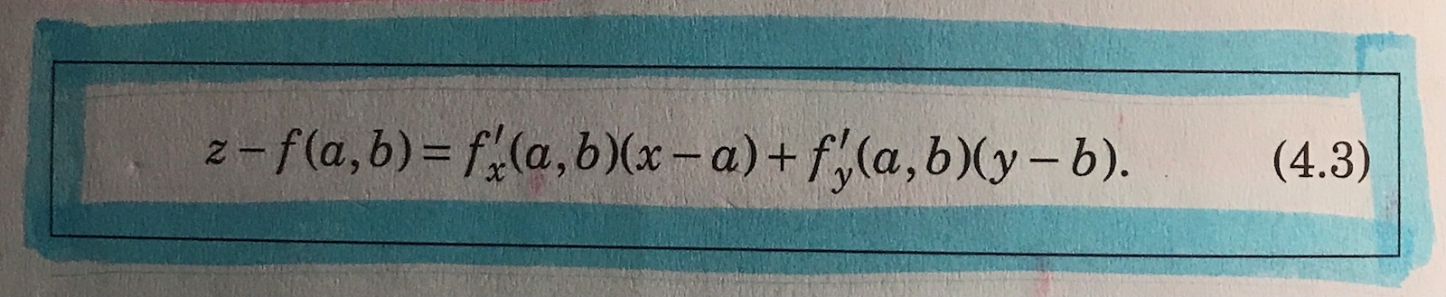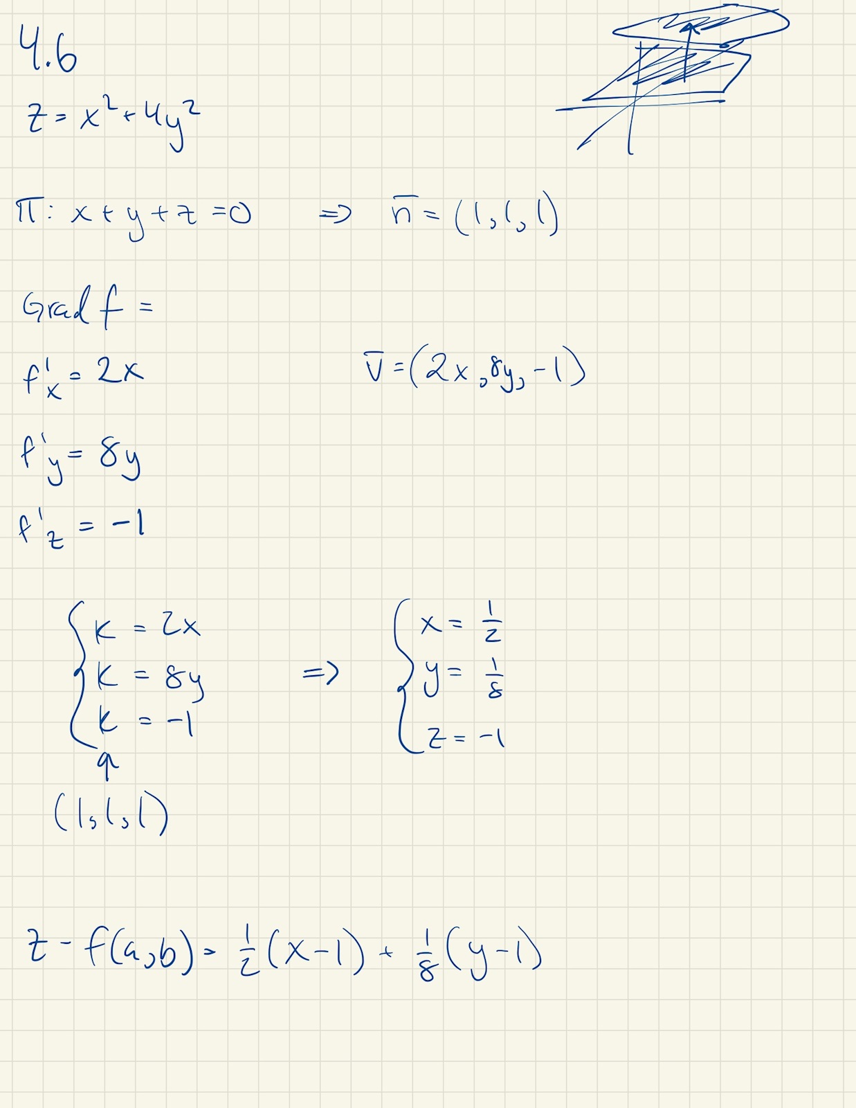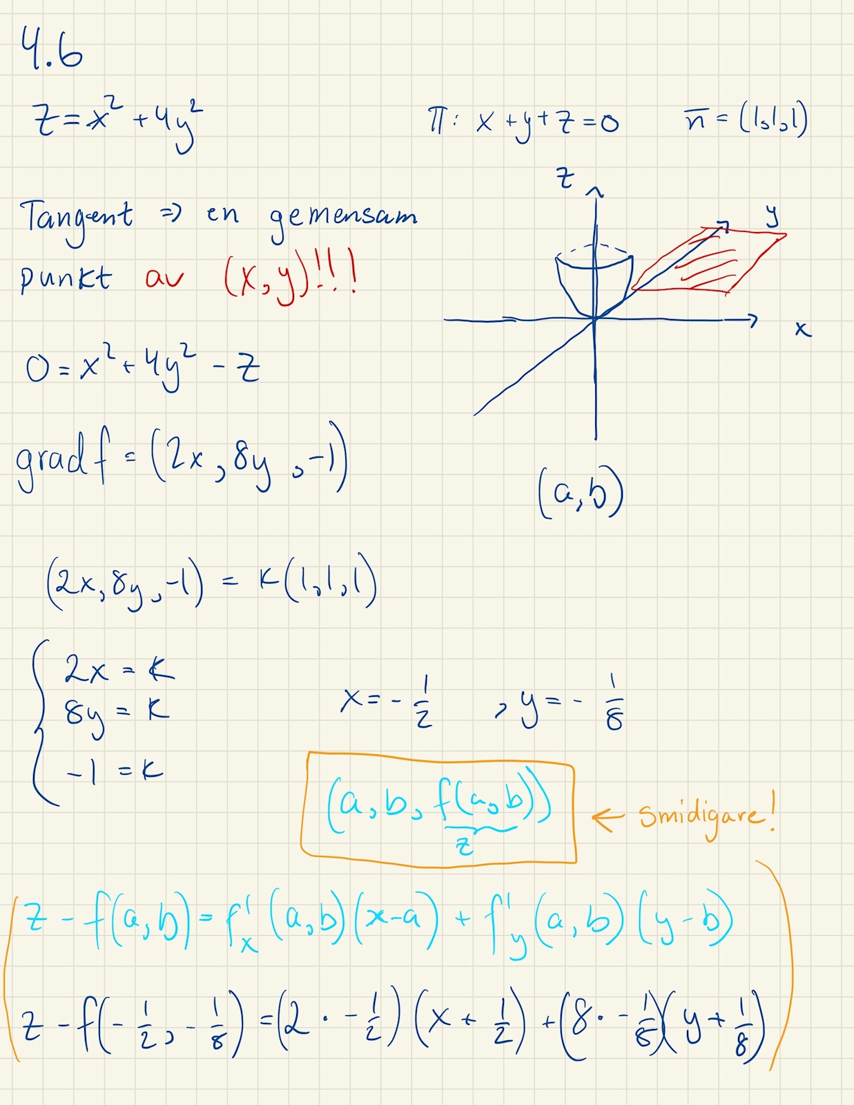 Bokstäverna och i formeln (4.3) i boken representerar - och -koordinaterna av tangeringspunkten, så i denna konkreta uppgift är och eftersom det är just i denna punkt som normalvektorn till ytan, d.v.s. , är parallell med normalvektorn till det givna planet, d.v.s. .