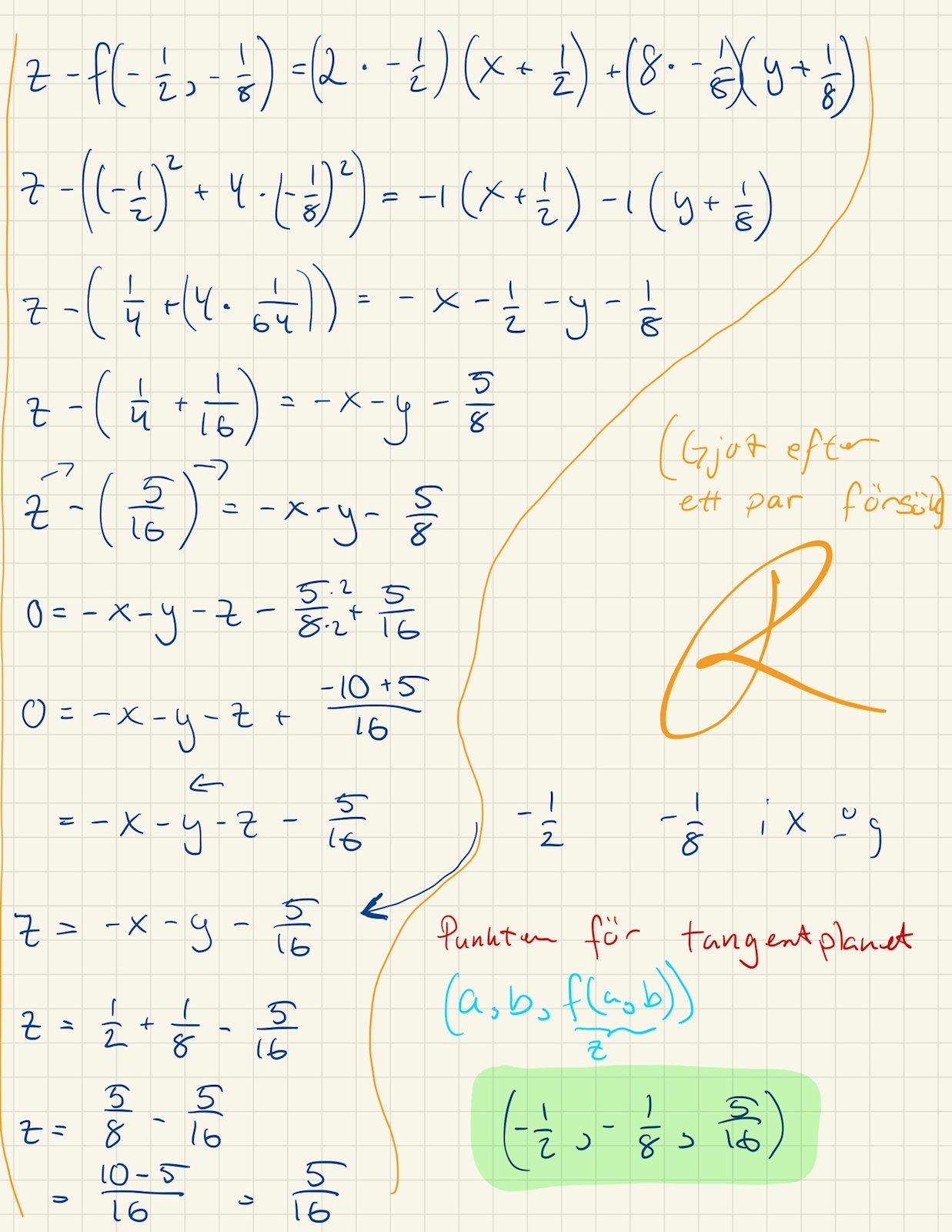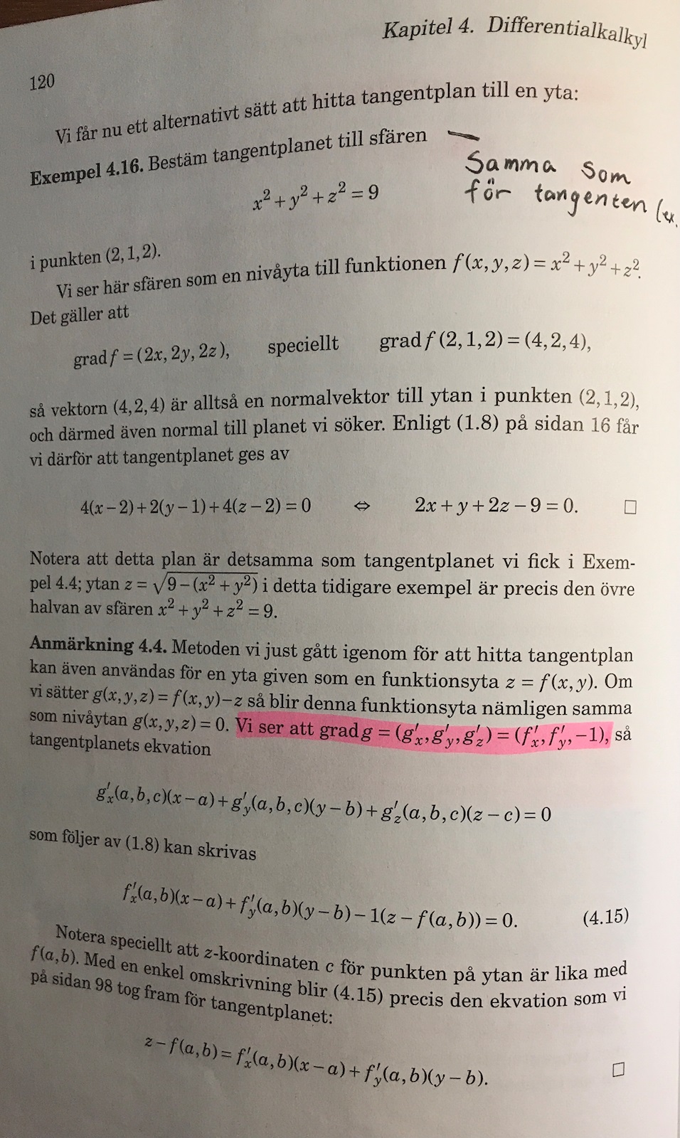 - För det första ska vara en funktion om "" ska vara meningsfullt. Du har angett att är en ekvation, vilket innebär att är ett odefinierat objekt. Om du skriver om ekvationen till , så kan du definiera funktionen för att beskriva ytan som en nivåyta . Med en sådan funktion är meningsfull och då blir verkligen en normalvektor till tangentplanet.