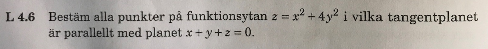 Bestäm alla punkter på funktionsytan z=x^2+4y^2 (J.Månsson 4.6)