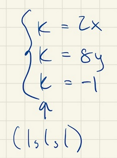 Notera att din normalekvation endast ger dig värden på x och y. Du sätter z = k = -1. Men du har inget fog för detta. Gå tillbaka till ekvationen för funktionsytan och räkna ut z-värdet svarande mot de värden på x och y som du tagit fram.