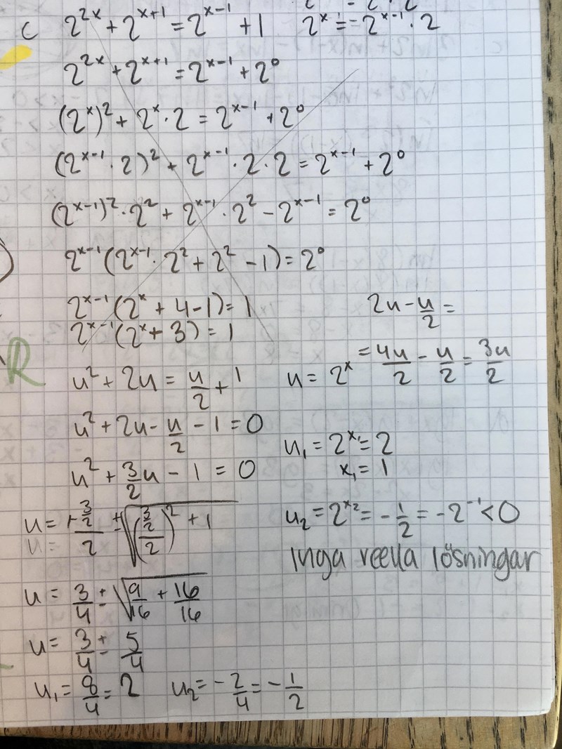 Jag provade nu att sätta u=2^x och fick u till 2 och -1/2. Då blir x=1 men vet inte riktigt hur jag ska få ut vad x blir med u=-1/2. Hur som helst är rätt svar x=-1 och det har jag inte fått...