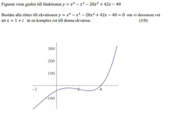 Du kan läsa av en rot i grafen (kolla så att det stämmer!) och du har fått en rot i uppgiften. Om du kommer ihåg att de komplexa rötterna alltid kommer i par när polynomets koefficienter är reella, så har du en till gratis. Multiplicera ihop dessa och gör en polynomdivision, eller multiplicera ihop de fyra faktorerna och identifiera koefficienterna.