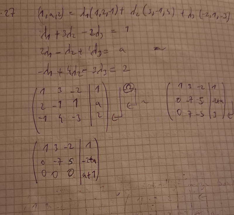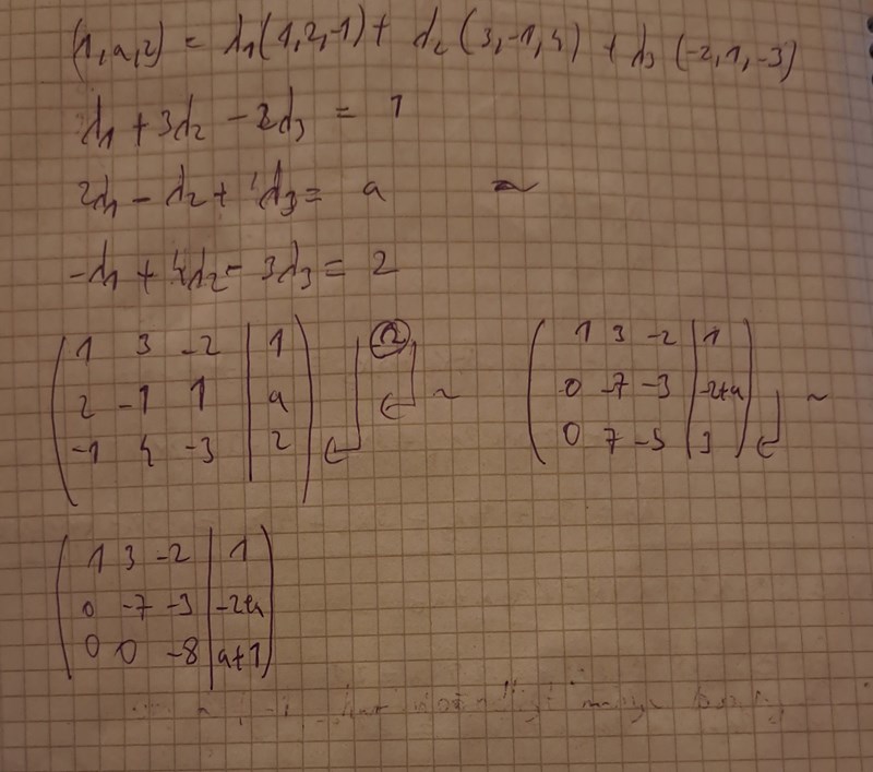 jag vet ej vad jag ska dra för slutsats av detta. Jag gausade och får på sista raden att a=-1 ger att ekvationssystemet saknar lösningar. Hur ska man tolka med antal lösning och linjärkombination?