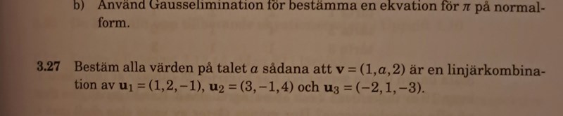 Bestäm alla värddn på talet a sådan att v är en linjärkombination av u1 ,u2 och u3.