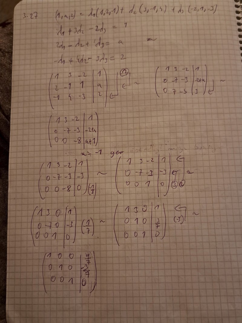 Du har missat i Gaussningen. Från första matrisen till din andra matris blir andra raden (0, - 7, 5). Du har skrivit (0, - 7, - 3).