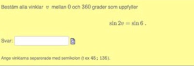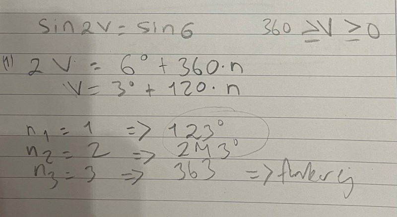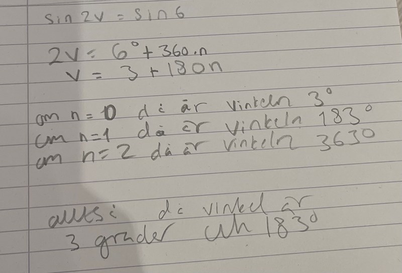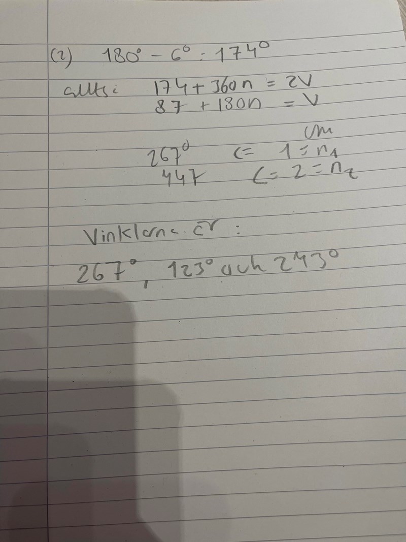 Men i fall (2) har du på pappret v = 87+ n*180o och det ger 87o och 267o  som är ytterligare 2 lösningar mellan 0 och 360o
